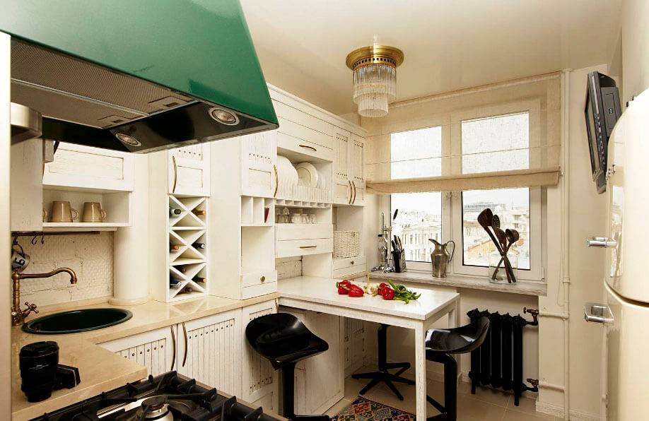 Компактный холодильник вместо тяжелого и крупногабаритного агрегата. Он может быть встроенным, благодаря чему экономия места на кухне будет еще более существенной. Современные производители давно наладили выпуск подобных холодильников, которые идеально подходят для установки в малогабаритных квартирах.