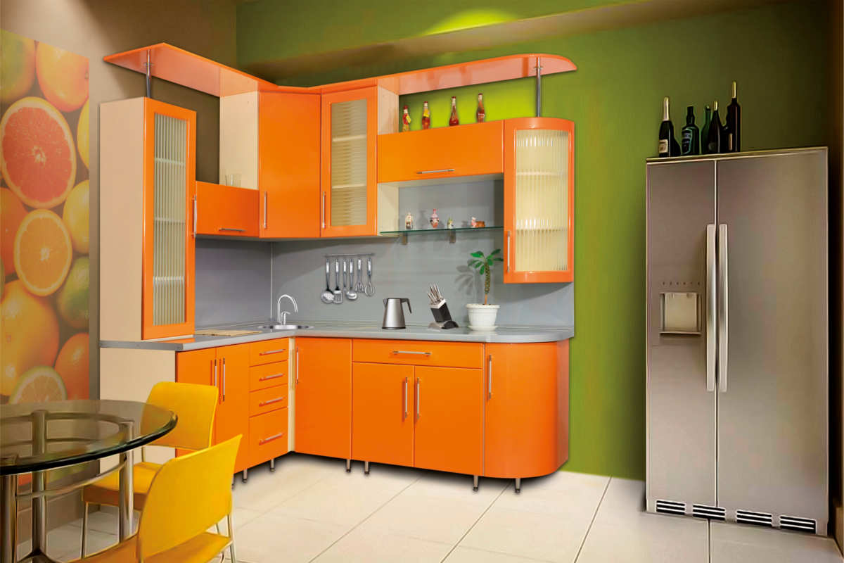 - Белый с оранжевыми элементами. Такое сочетание можно разбавить деревянной столешницей.