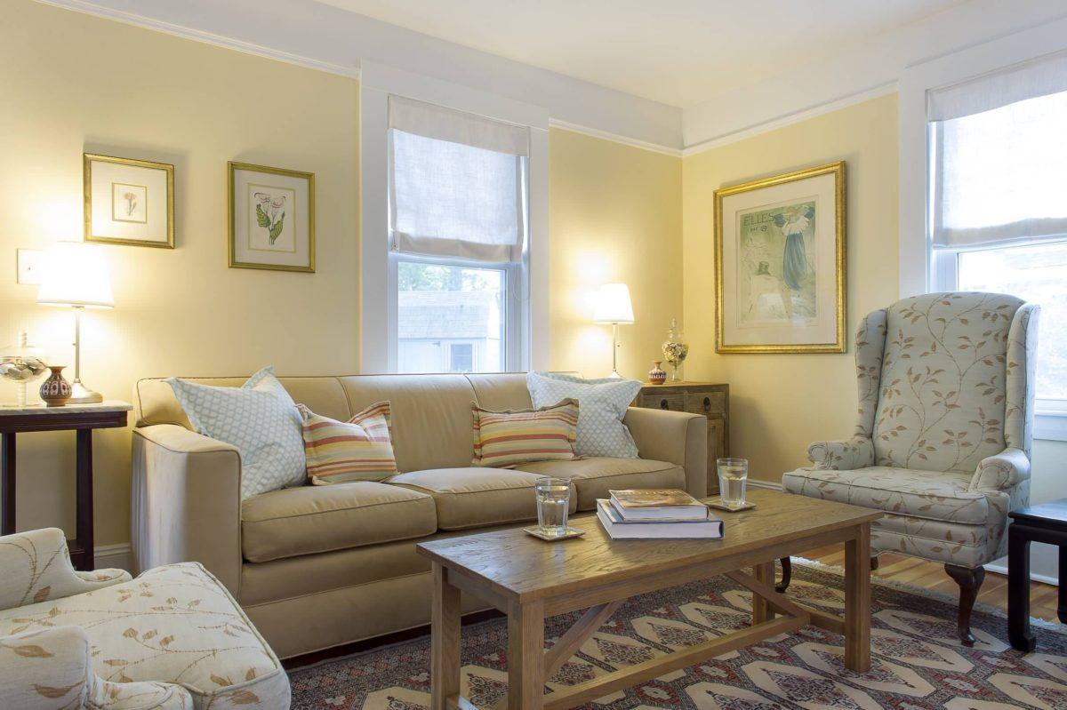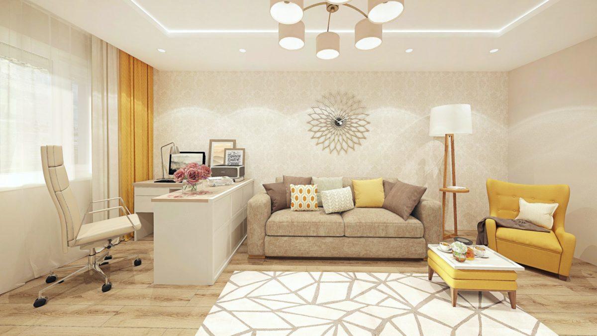 Слишком яркий и ядовитый оттенок желтого в гостиной небольшой площади будет давить, а пастельные и легкие цвета поспособствуют общению, повысят внимание и настроение