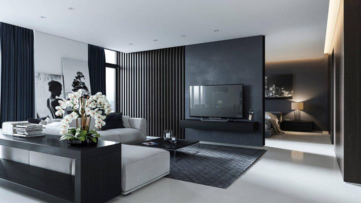 - Комбинация из черного и белого. Универсальные тона подойдут для любых стилей гостиной.