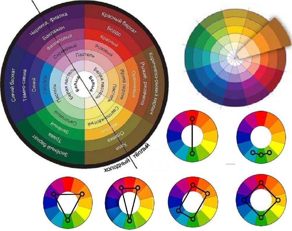 Как же пользоваться цветовым кругом? Это довольно просто, нужно только знать схемы и не бояться «играть» с колесом. Схем по сочетанию цветов в круге существует множество (см. рисунок ниже). Но есть три базовых алгоритма.