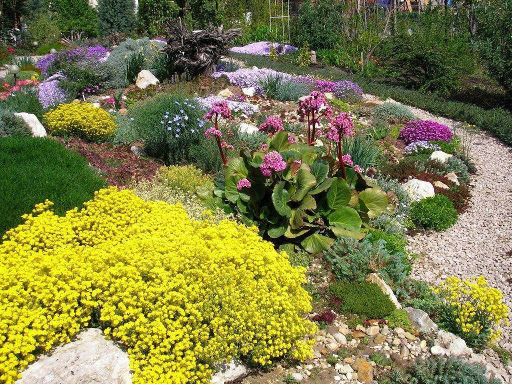 Низкорослый многолетник сорта Горное золото образует яркий ковер на клумбе. Кустики цветущего растения с полегающими побегами покрыты небольшими пышными соцветиями до самых заморозков.
