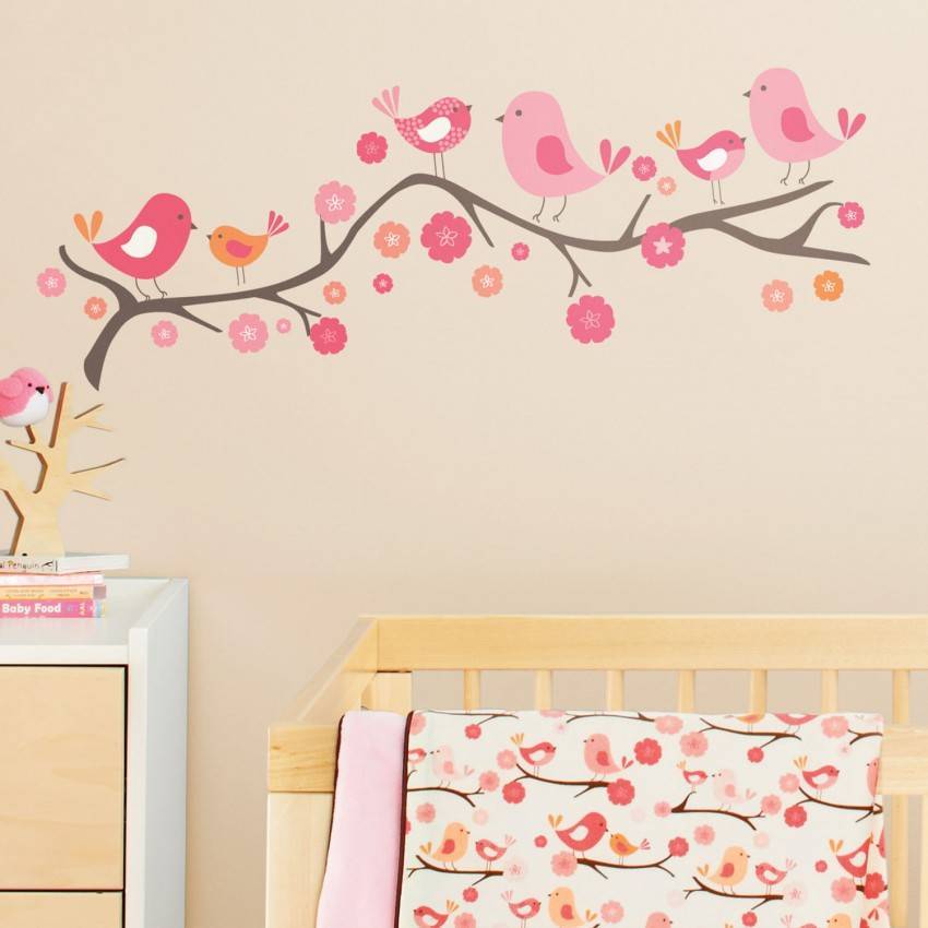 Тематика оформления стен может быть разнообразной – от отдельных элементов (цветы, бабочки – для девочек, машинки, самолетики – для мальчиков) до сюжетных картин, занимающих до половины стены. Часто встречаются наклейки, помогающие создать необычный декор стены в сочетании с другими элементами – например, фотографиями: основа-дерево – это стикер, к которому «подвешиваются» на «ветки» фоторамки.