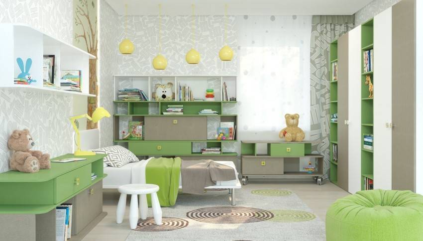 Если площадь небольшая, мебельный гарнитур расставляйте у стенок, не перегружайте множеством ненужных предметов. Например, если ребенку уже год, то пеленальный столик в комнате совсем ни к чему.