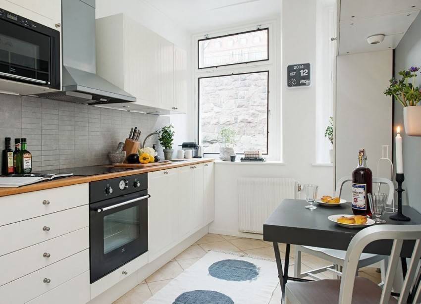 Для удобства и экономии пространства можно использовать раздвижные столы или барные стойки. Также стоит позаботиться о дополнительном освещении, которое сможет визуально увеличить объемы комнаты. В некоторых случаях уместно использовать встроенный шкаф-купе, особенно если на кухне имеются ниши.