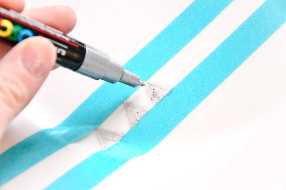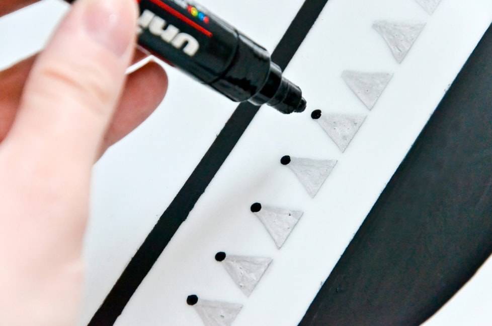 Между полосками рисуем небольшие треугольники фломастером серебристого цвета.
