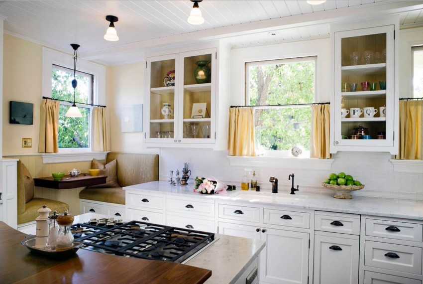 Для увеличения кухонной зоны также используются компактные подвесные шкафы. А что касается декора, то здесь не стоит переусердствовать. Достаточно будет нескольких элементов, которые лучше организовать на стенах, подоконнике и на подвесных шкафах.
