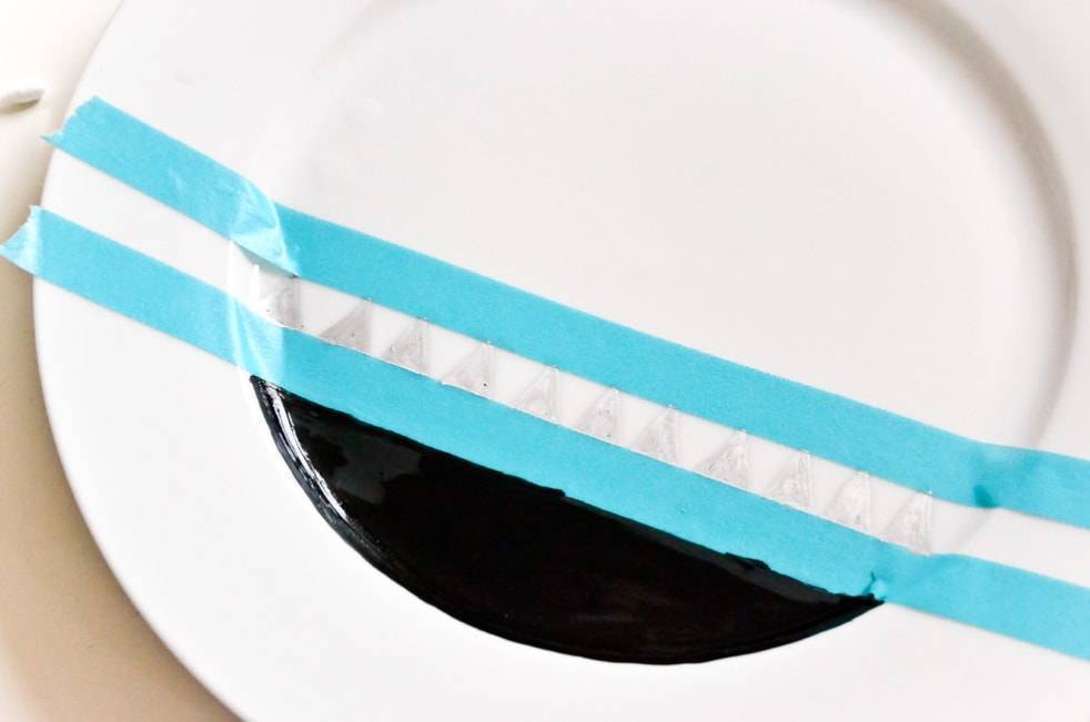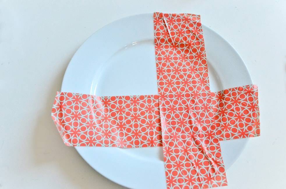 В данном случае используем более широкий скотч. Заклеиваем отрезком практически половину тарелки.