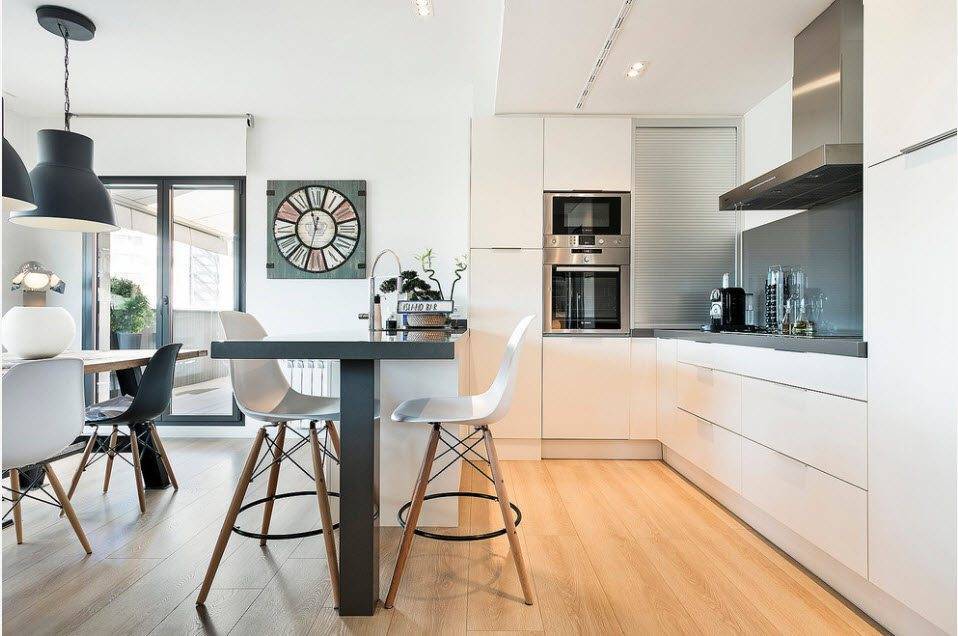 - Стиль минимализма идеален в вытянутой кухне на 8 метров. Молодежная барная стойка модно заменит обеденный стол и сохранит пространство, а прозрачные пластиковые стулья привнесут иллюзию свободы, да и интерьер будет более воздушным.