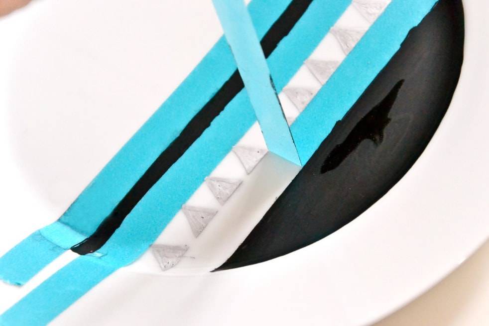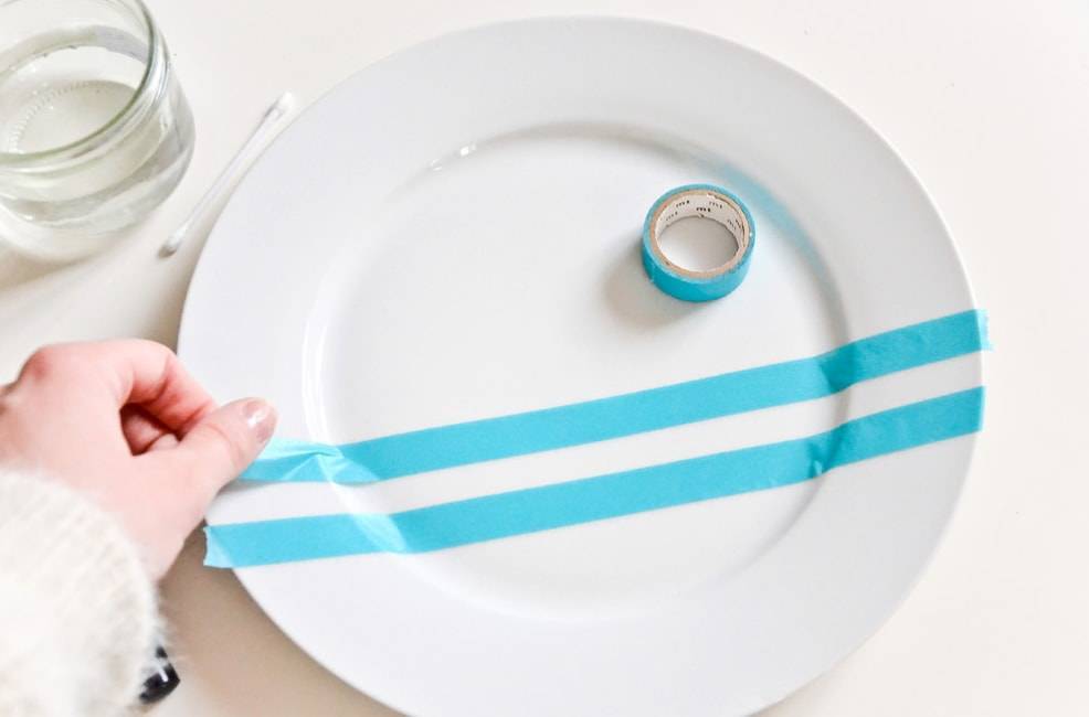 На тарелку приклеиваем две полоски скотча параллельно друг другу.