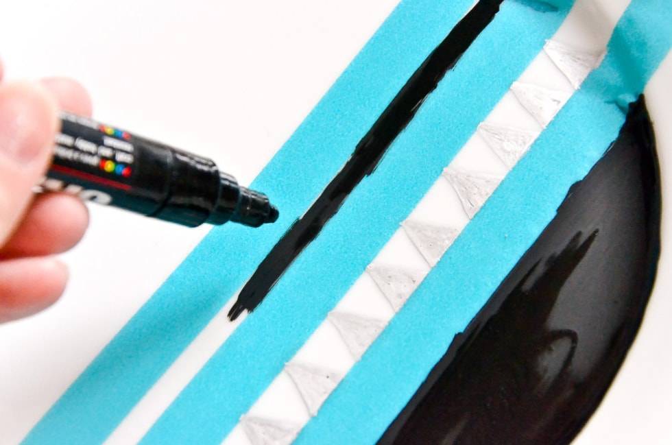 Над двумя полосками скотча наклеиваем еще одну с меньшим расстоянием. Заполняем пространство между двумя полосками черным цветом.