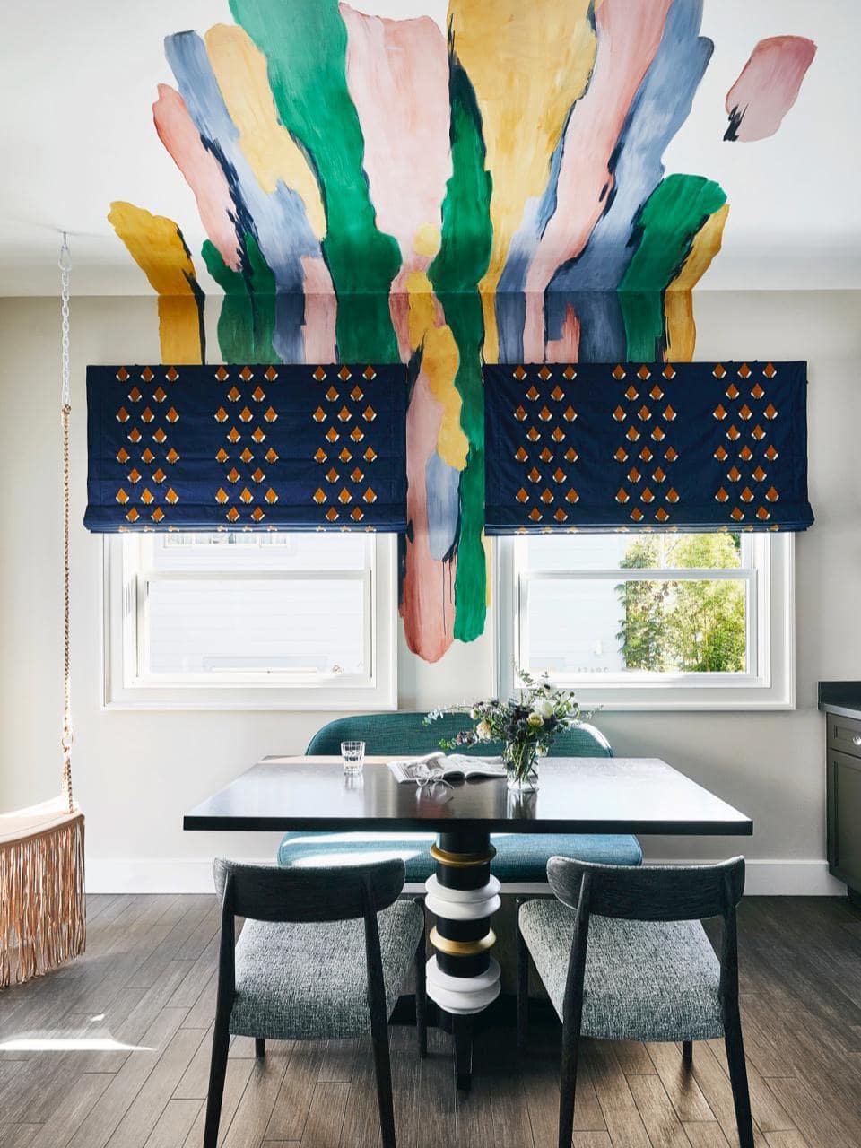 Если вы считаете, что однотонная поверхность – это слишком скучно, то белая краска в качестве исходника и набор разноцветных колеров быстро решат эту проблему. Сделайте два-три, десять разных цветов. Это могут быть продольные или поперечные полосы или комбинированные варианты в виде клетки с большими и маленькими ячейками. Для ровной симметрии вам понадобятся малярный скотч и пузырьковый уровень. Можно украсить потолок национальным флагом. Старый британский Юнион Джек или звездно-полосатый родом из США все еще в моде. Кстати, и трафаретное нанесение рисунков очень популярное явление.