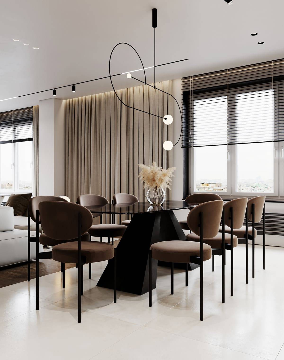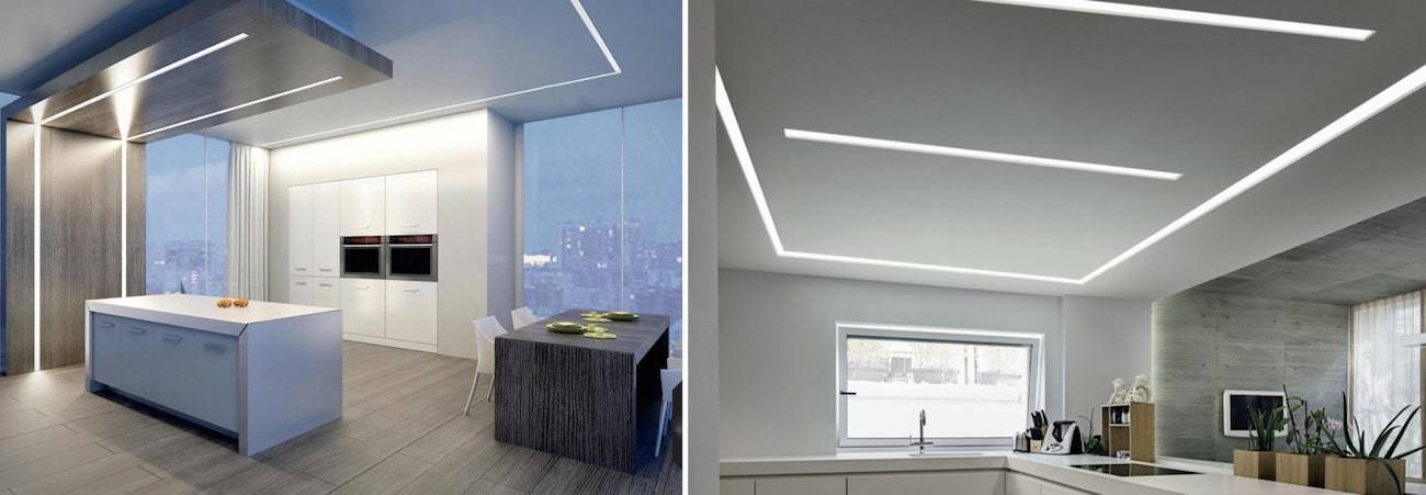 Парящая линия на потолке в интерьере кухни выглядит стильно