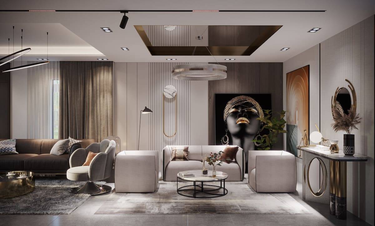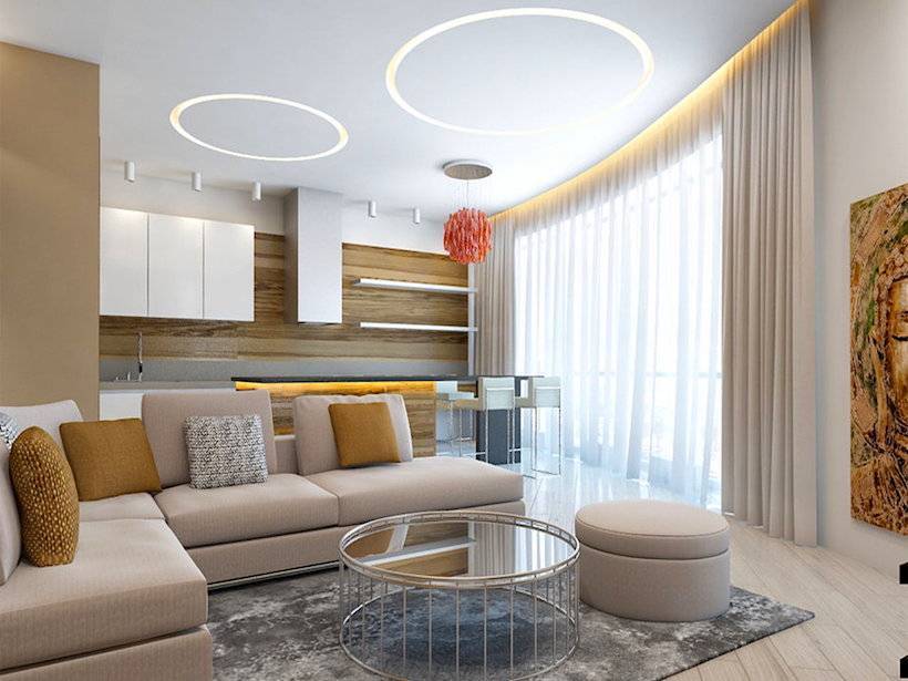 Современный дизайн потолка в гостиной