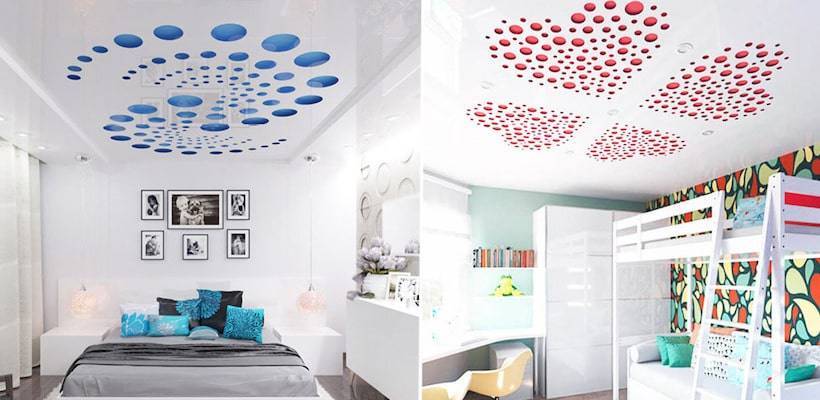 На пленку может быть нанесено любое изображение, подчеркивающее индивидуальность и уникальность интерьера. Стоит ли наносить на потолок узор, необходимо решать исходя из особенностей и назначения комнаты. К примеру, в детской интересный рисунок будет вполне уместен, а в зале обычно лучше смотрятся более лаконичные решения.