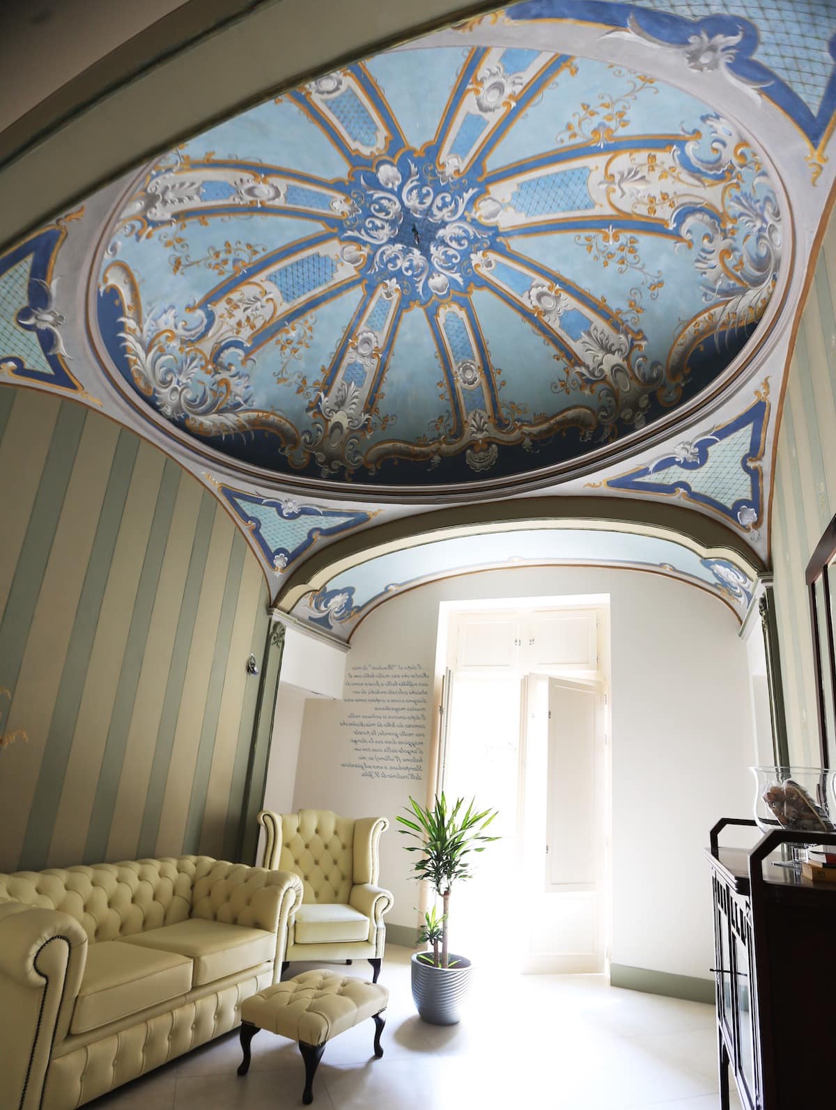 Интересно смотрится орнамент, переходящий с потолочной плоскости на часть стены. Такое решение позволяет элегантно зонировать пространство, внося в него необычный декоративный элемент.