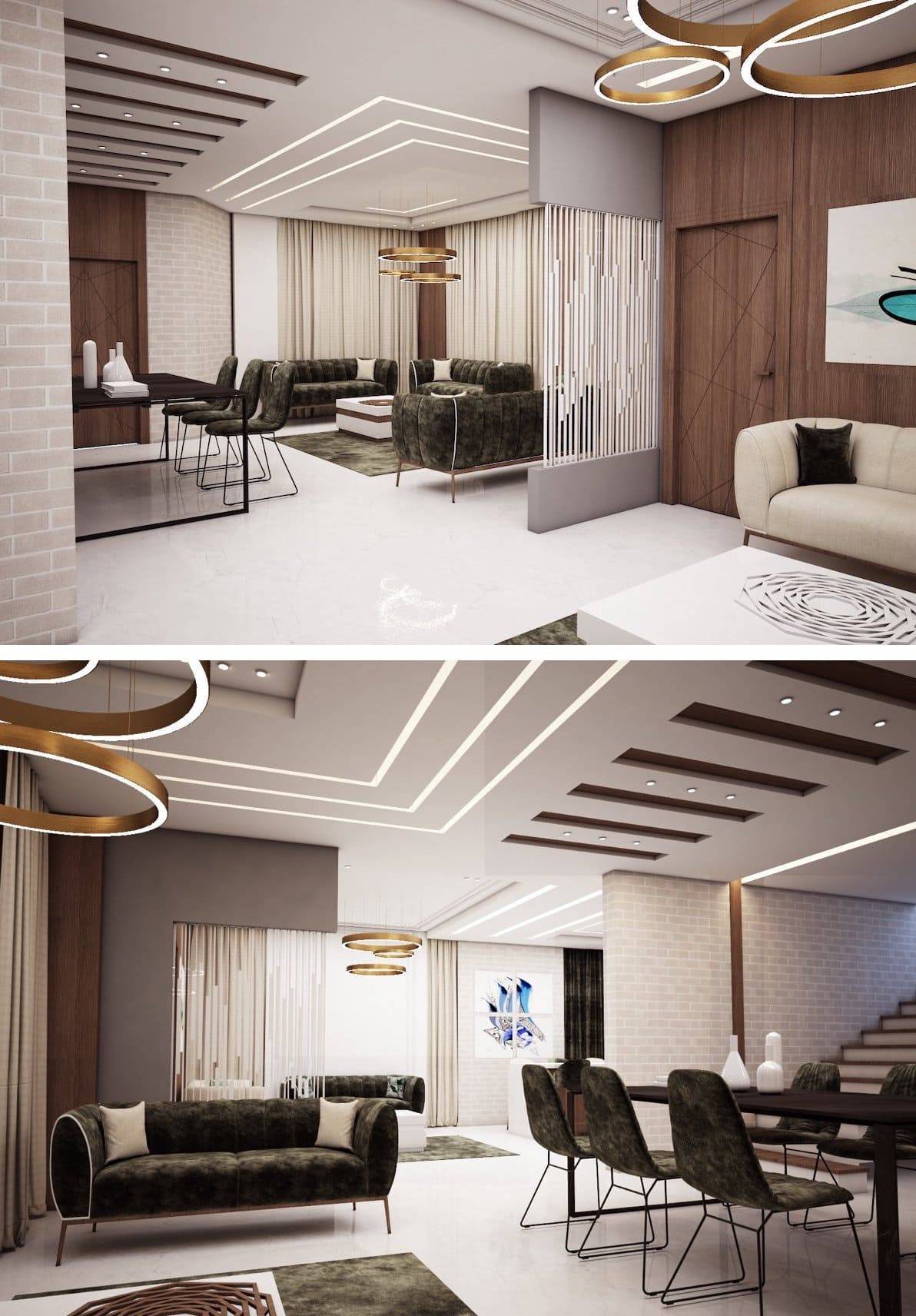 Еще одна современная тенденция — это зонирование помещений при помощи многоуровневых подвесных потолочных конструкций. В идеале визуальные границы повторяются в решении полового покрытия.