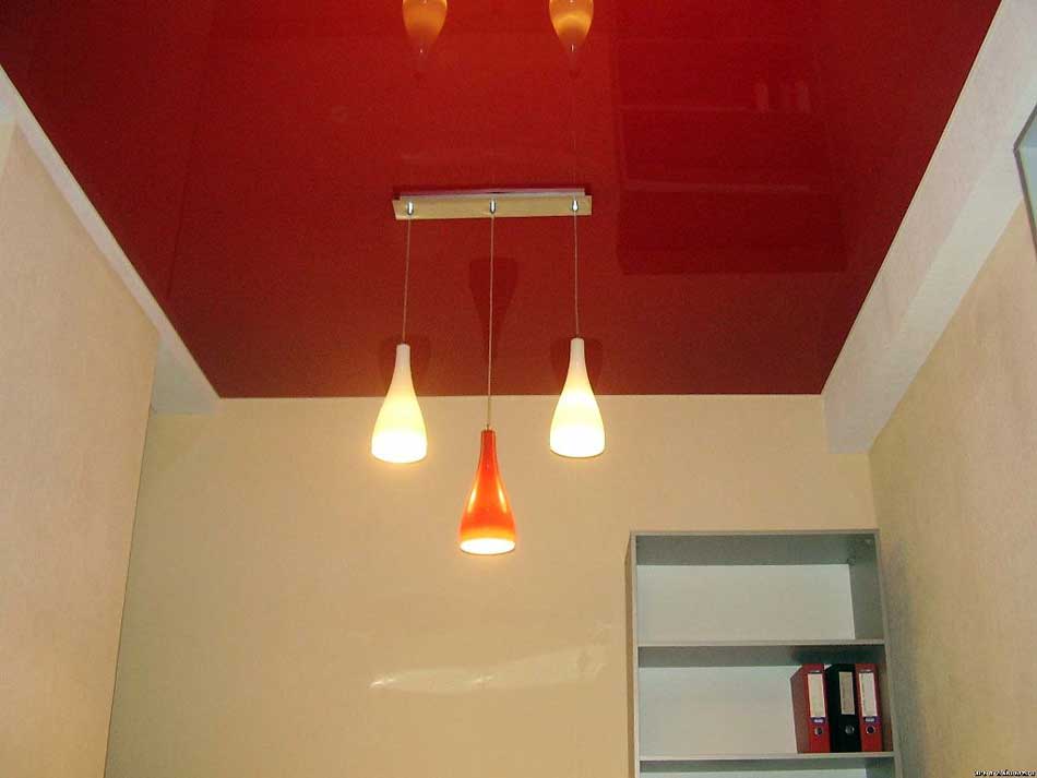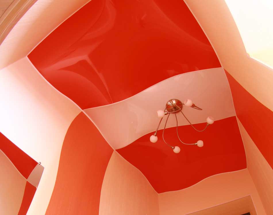 Красный, самый горячий цвет. Потолок такого оттенка чаще всего используют в развлекательных заведениях.