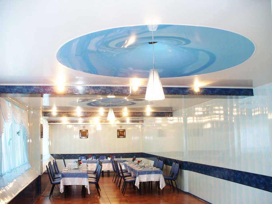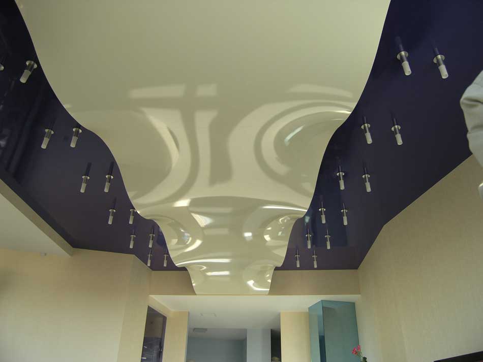 Разноцветные конструкции необходимо подбирать под стиль интерьера. Может быть вам подойдет голубой, шампань, кремовый, бордовый или материалы с узором. Часто применяется натяжной потолок шоколадного, сиреневого, золотого, серебристого цветов.