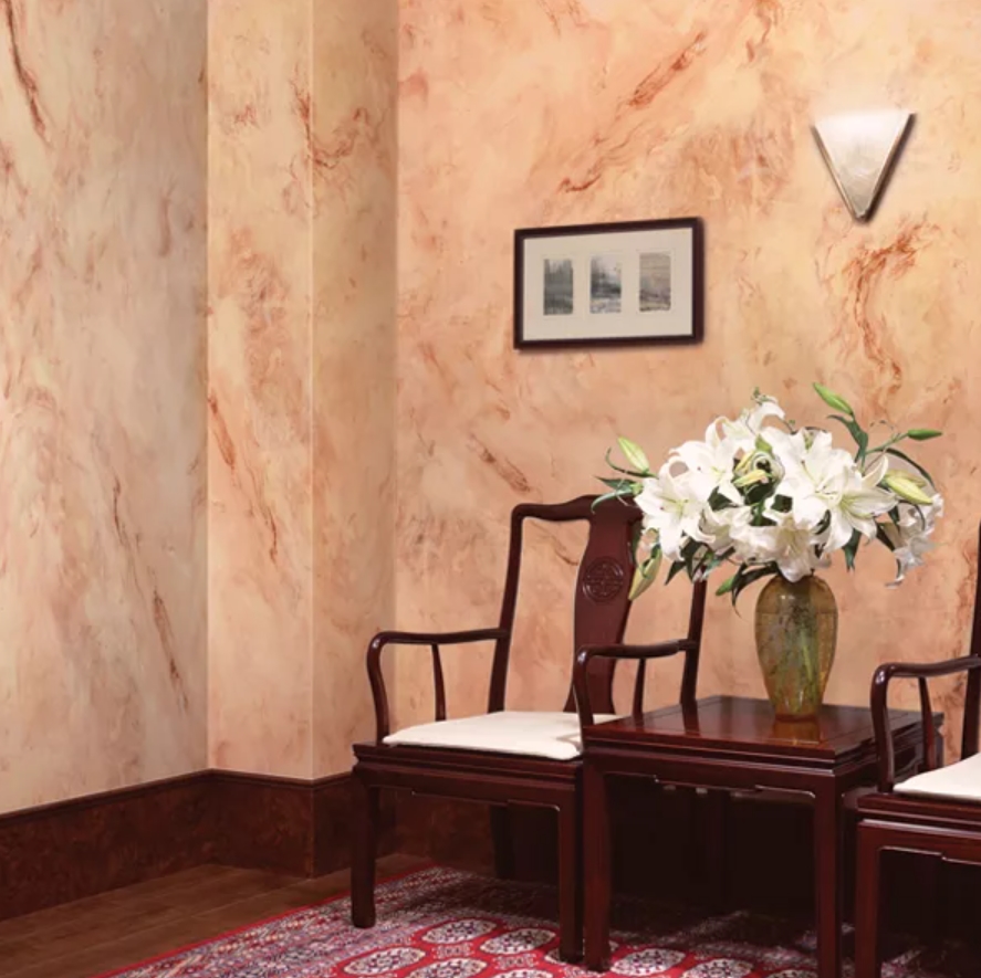 Встречаются варианты, имитирующие мрамор и оникс. Нанесение осуществляется слоями.