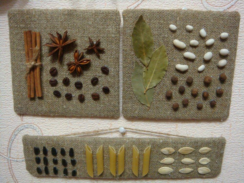 С их помощью можно выложить любые картины, например, чашку кофе, что уже выдерживает тематику. Можно вырезать фотографии красивых фруктов и овощей, дополняя их крупой.