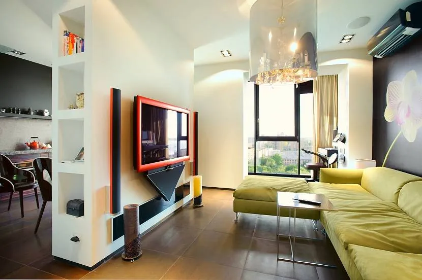 Телевизор может быть установлен вместе с кроватью, а может совершенно отдельно, например, с диваном. И тот и другой вариант довольно прост и удобен в исполнении. Конечно, для такой перегородки, если приоритетным фактором является звукоизоляция, лучше устанавливать из кирпича.