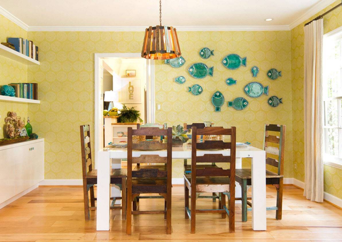 Не только украсить, но и привнести нотки задора и позитива в интерьер столовой помогла композиция из тарелок-рыбок разного размера, но выполненных в одной цветовой гамме.