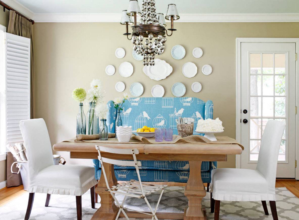 Необычный вариант декорирования стен столовой – составление картины-панно из тарелок разных размеров и цветов. Для аутентичности с картиной дизайнеры даже не пожалели некоторые из тарелок и обрезали их по контуру воображаемого прямоугольника настенного декора.