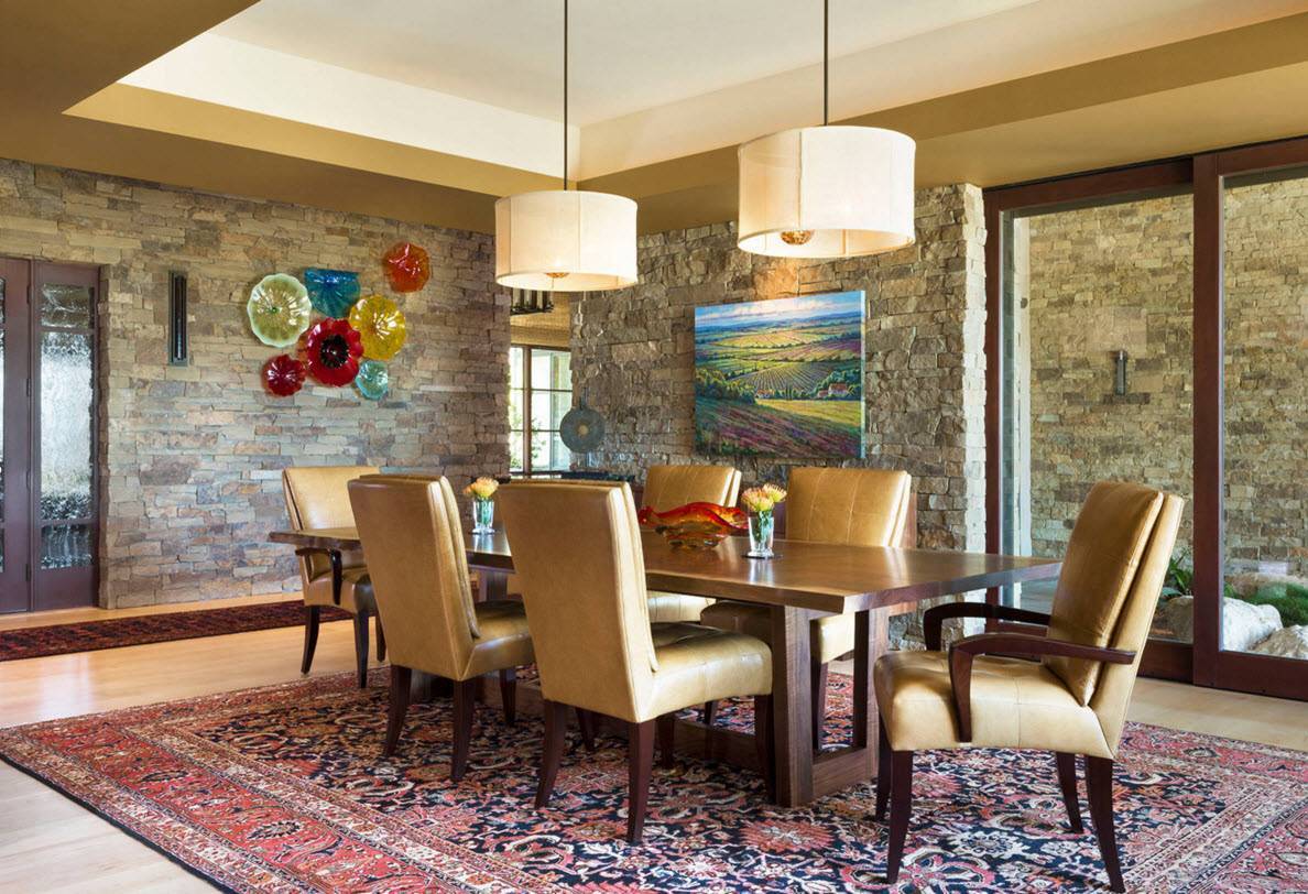 Яркие настенные тарелки из стекла отлично смотрятся на облицовке, имитирующей каменную кладку. Серовато-бежевые тона интерьера эффектно разбавлены колоритным исполнением необычных тарелок.