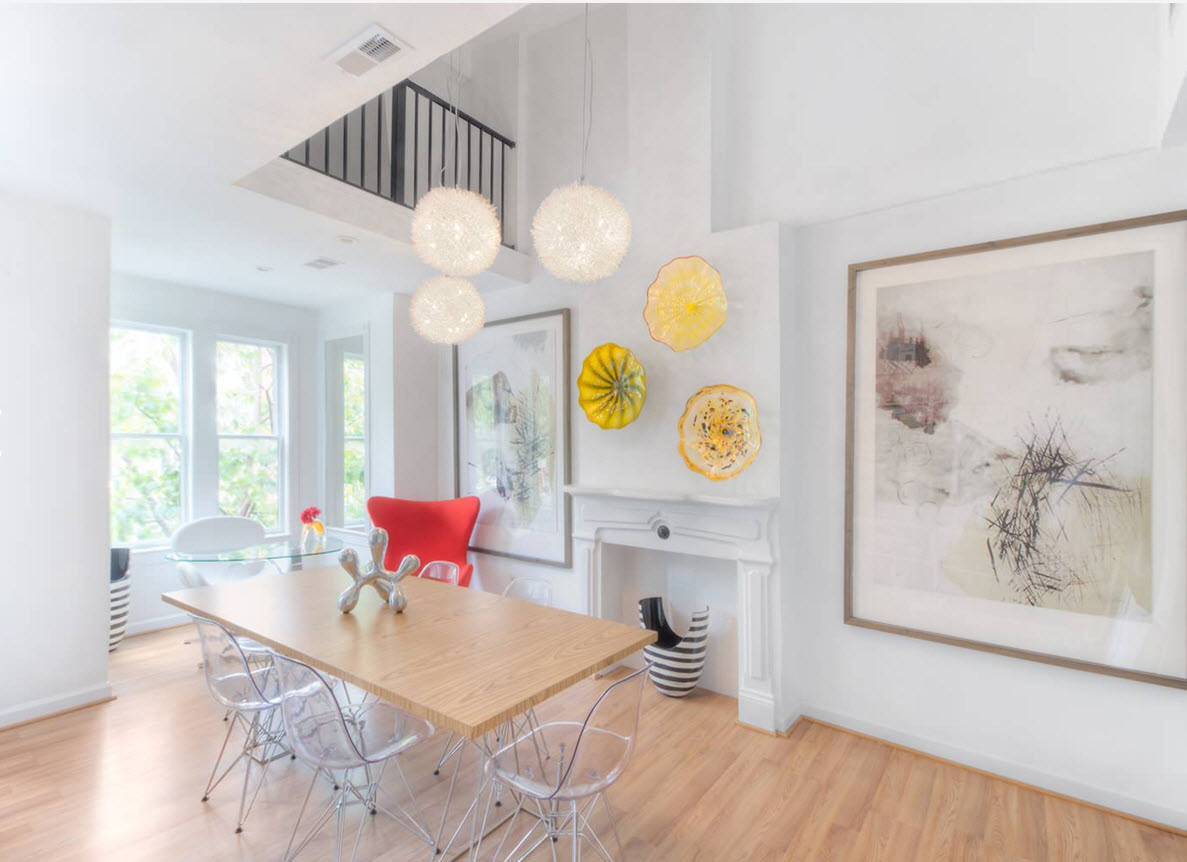 Крупный настенный декор необычной формы и расцветки, который даже сложно назвать тарелками, способен стать акцентным элементом интерьера. В практически белом помещении столовой яркие, колоритные предметы декора смотрятся «звездами» дизайна.