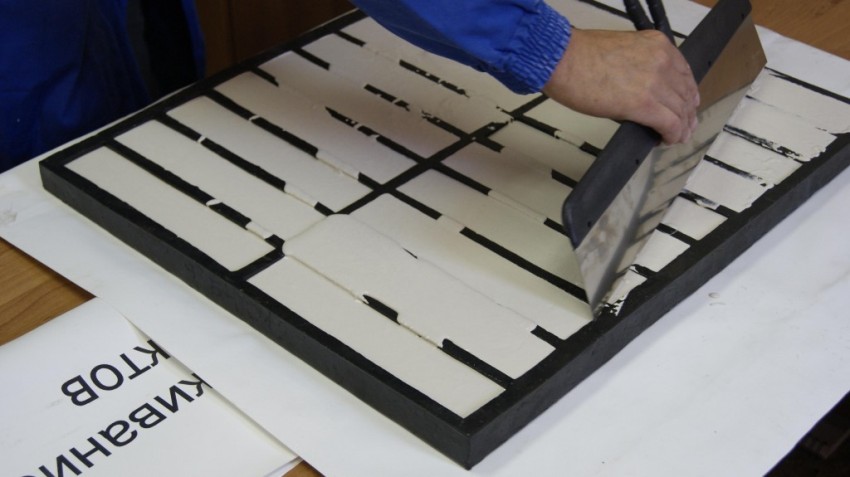 Для того чтобы сделать форму, скульптурный пластилин раскатывают ровным слоем, толщина которого должна составлять порядка 20 мм. Затем используя самый обыкновенный кирпич, внутри делают оттиски, который и послужат формами для отлива.