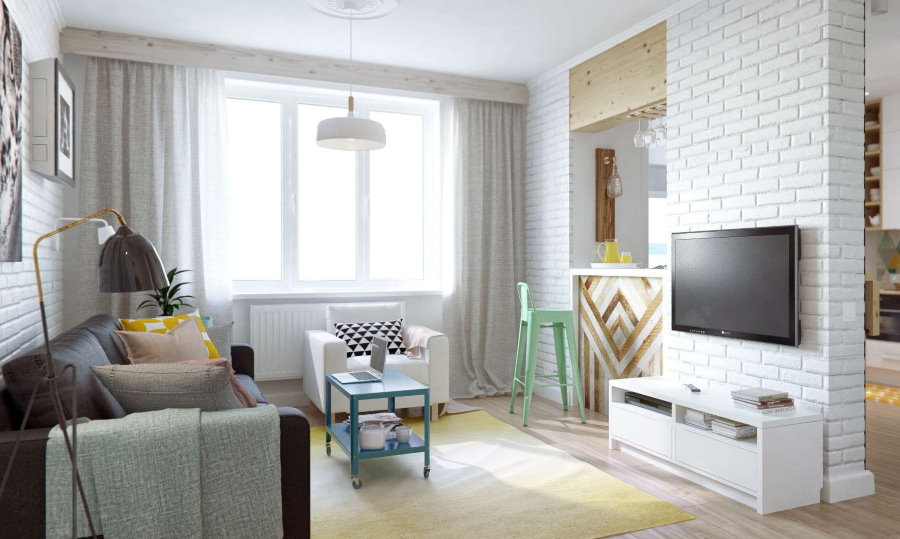 На фотографии вы видите белую кирпичную стену в кухне-гостиной. Проект BohoStudio «Интерьер квартиры 56 м2».