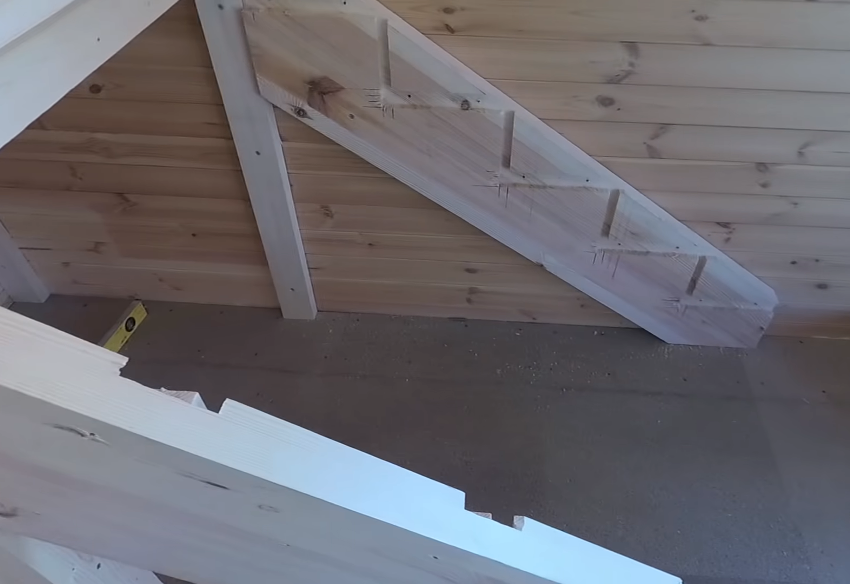 Для надежности крепления косоур вставляется в предварительно сделанный пропил в потолочной балке. В завершении для надежности он фиксируется анкерами к стенке, столбу и потолочной балке. При необходимости конструкция усиливается стальными уголками.
