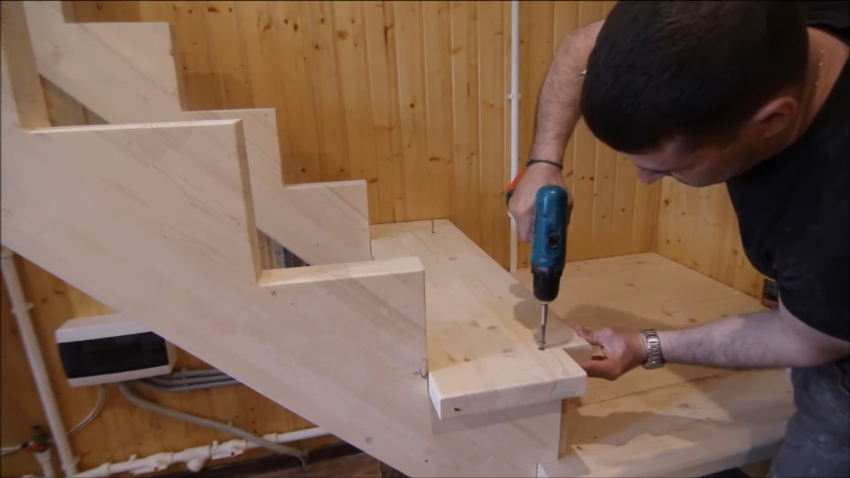 Установить ступени не составит особого труда. Вырезы косоуров промазывают клеем и приставляют к ним подступенки, которые затем необходимо выровнять и закрепить с помощью шурупов.