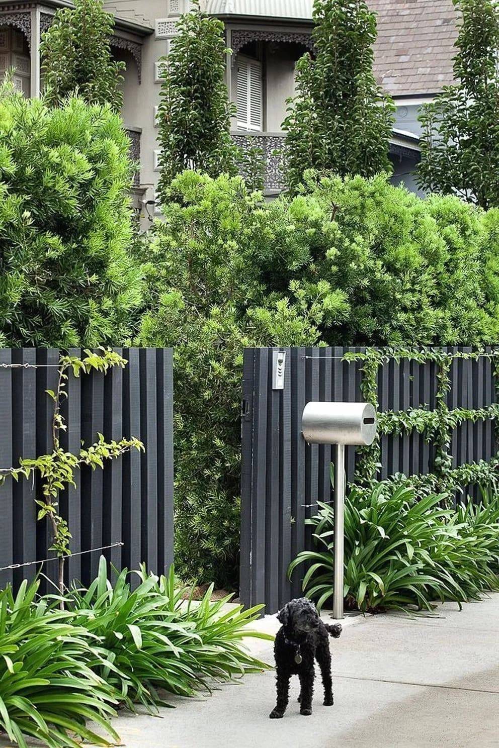 На фоне яркого профилированного листа особенно эффектно смотрится дизайн возле забора частного дома в виде зеленых насаждений, пирамидальных и шаровидных кустарников. Декоративные композиции можно сажать с обеих сторон, одновременно создавая образ участка с домом и уютного двора.