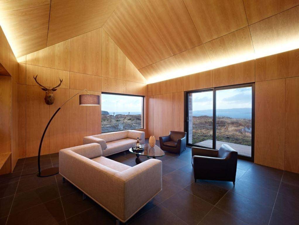 Охотничий домик – ещё один стиль, где потолок обязан быть деревянным. Он отличается от кантри более грубым оформлением и большим количеством необработанной древесины.