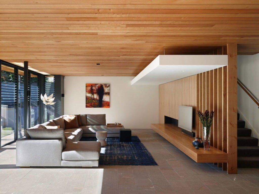 Потолок должен в любом интерьере выглядеть более невесомо, чем стены, что определяется не по весу, а по внешнему виду материала. Бетонные блоки, кирпичная кладка, вид натурального камня в оформлении стен станут прекрасной основой для использования потолков из дерева. Не обязательно использовать натуральный камень и кирпич. Вполне можно ограничиться имитациями этих материалов, которые представлены в строительных магазинах в виде клинкерной облицовочной плитки.