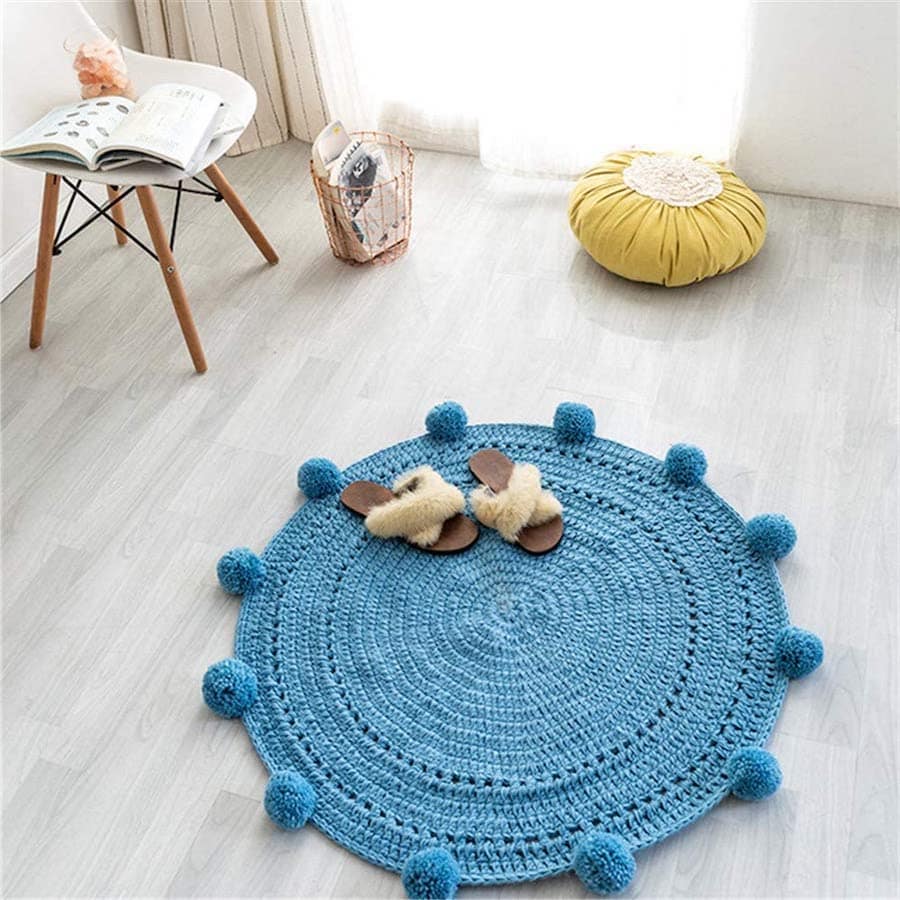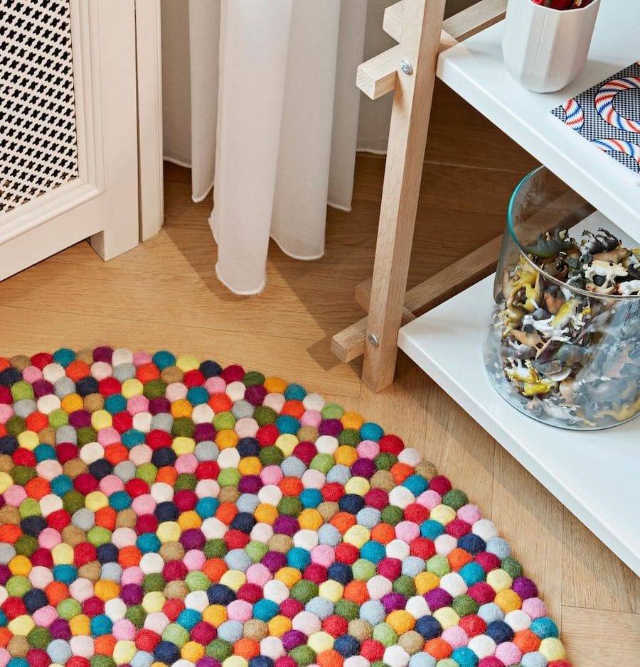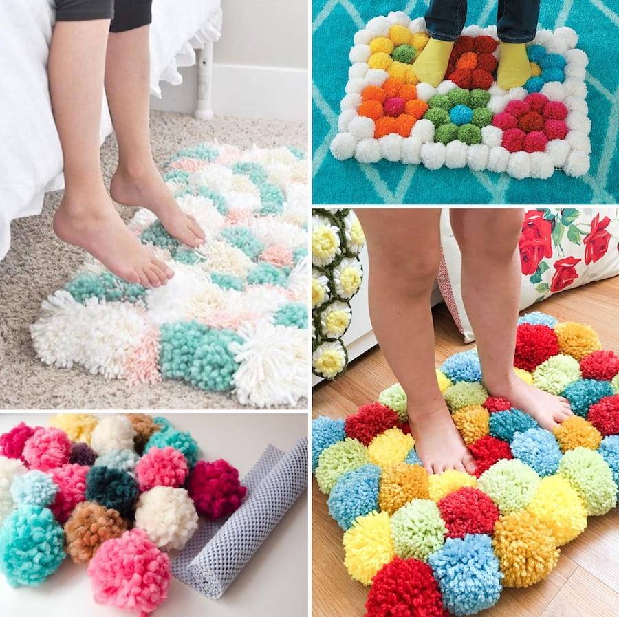 Создавать удивительно уютные коврики можно даже из пушистых помпонов, располагая их хаотично или в определенном порядке. Композиционные решения в этом случае получаются самые неожиданные, например, в комнате вдруг появляется цветочная поляна.