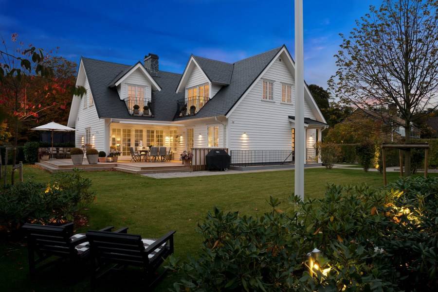 Фасады домов в скандинавском стиле окрашиваются в белоснежный цвет при отсутствии другой отделки.