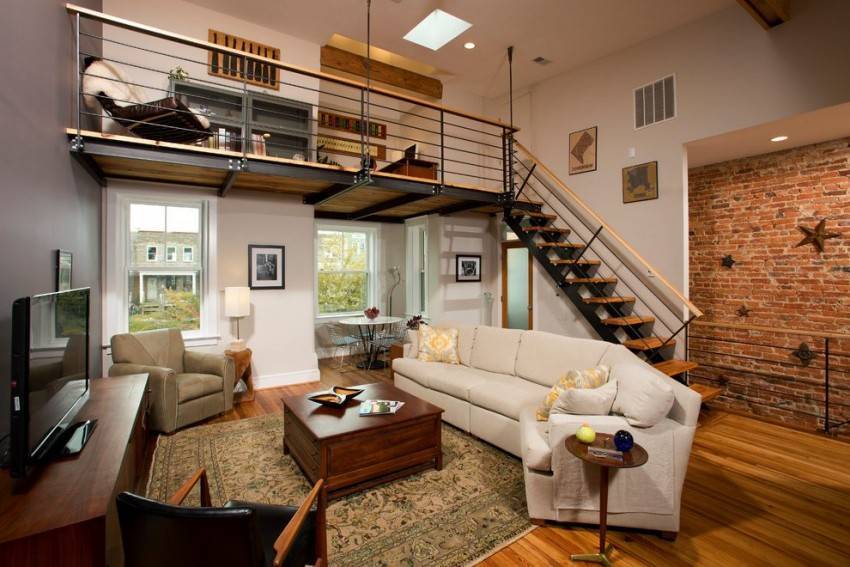 Такой интерьер можно назвать классически соответствующим стилю лофт. Это кирпичные стены, трубы и другие коммуникации, большие проемы окон фабричного типа, металлическая лестница.