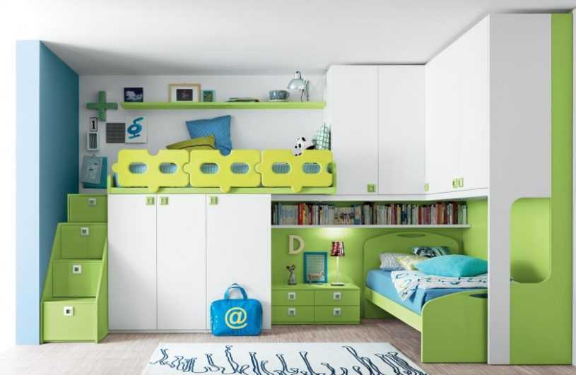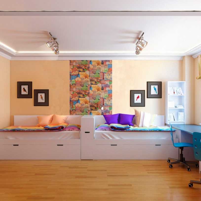 Также популярно расположение кроватей по одной стене. С противоположной стороны устанавливаются системы хранения, и обустраивается зона для игр.