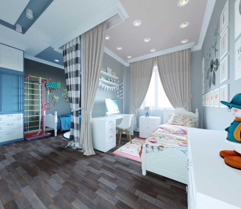 Гораздо проще зонировать большую детскую с двумя окнами. Помещение делится симметрично: ширмой, мебелью или шторой, чтобы у каждого обитателя оставалось место для уединения.