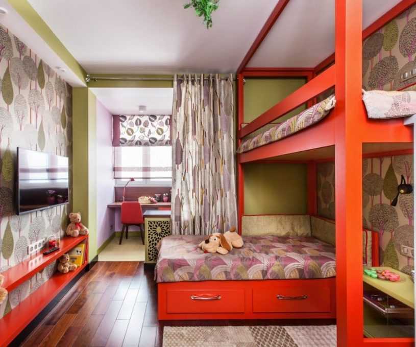 На фото удачное решение для вытянутой детской с совмещенным балконом.