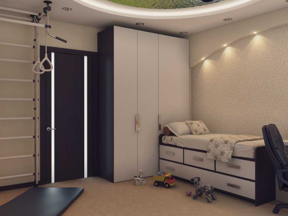 В комнатах с высоким потолком стоит рассмотреть идеи создания двухъярусного пространства. Мальчики, равно как и девочки, обожают «домики на дереве» и охотно будут спать на кровати, приподнятой на несколько метров от пола. Главное, продумать меры безопасности, чтобы ребенок легко спускался и забирался в свое гнездышко. Под кроватью можно расположить гардеробную, рабочий кабинет, спортивный уголок.