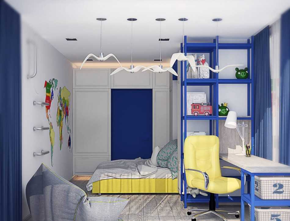 В детской двух мальчиков-школьников дизайн комнаты практически не приемлет нежные пастельные цвета. Наиболее распространен синий во всем многообразии его оттенков. Можно в сочетании с другими цветами применять серый, коричневый, черный, красный.