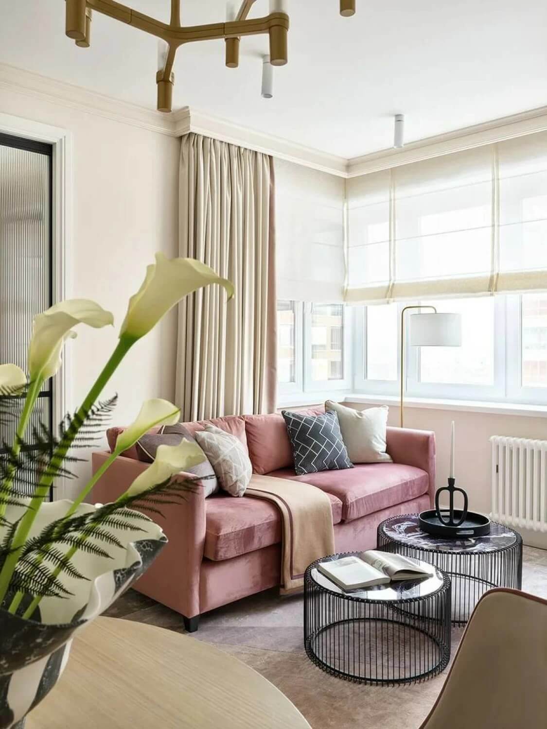 В качестве финальной точки для респектабельного интерьера дизайнер Елена Маркина выбрала диван нежно-розовых тонов в стиле американской классики.