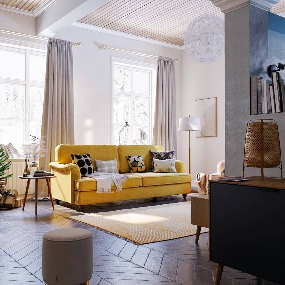 Сочный жёлтый диван оживляет интерьер гостиной в сдержанных природных оттенках. Диван-кровать Orson