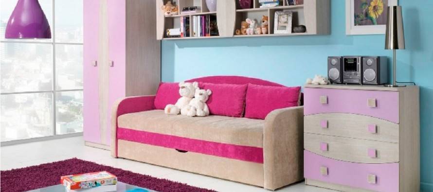 В детскую лучше поставить яркий диван с интересными принтами, возможно рисунки мультяшных героев;