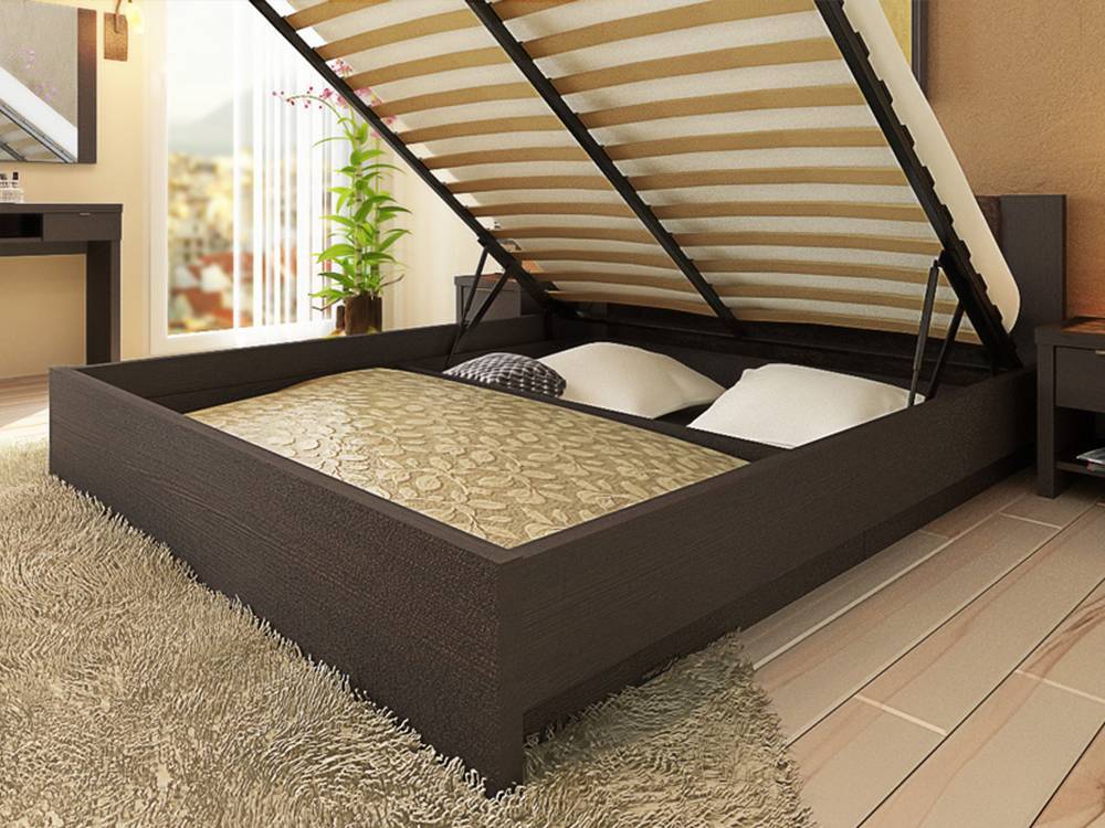 Помимо основного оснащения некоторые модели дополнены различными элементами. Одним из них является ящик с подъемным механизмом для белья. Такой вариант – прекрасное дополнение к ортопедическому основанию. Некоторая мебель имеет функцию регулировки жесткости ламелей.