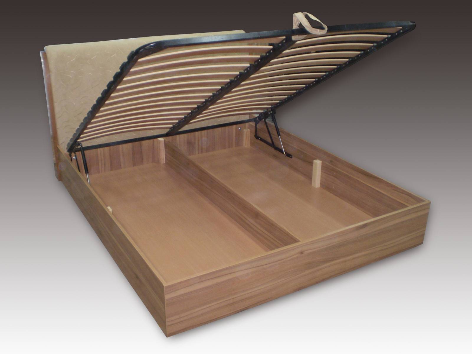 Основные узлы кровати – это каркас, основание и матрас. Матрас можно заказать отдельно или использовать тот, что остался от предыдущей кровати. Основание – это то, на что матрас ложится и вместе с чем он поднимается посредством соответствующего механизма. Ну а каркас – это собственно большой ящик для полезных вещей, на котором расположены основание и матрас. Итак, что нужно знать про эти элементы при выборе двуспальной кровати с подъемным механизмом.